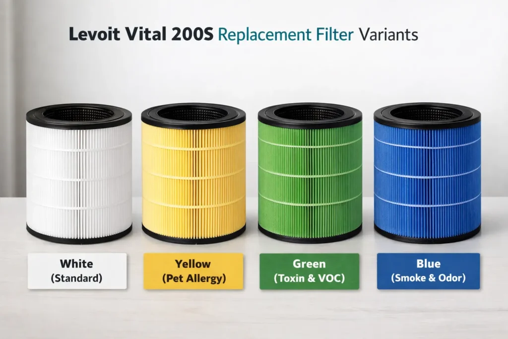 The Levoit Vital 200S replacement filter is Vital 200S-RF (white/standard). Four variants available — White, Yellow (pet), Green (toxin), Blue (smoke). Fits both the Vital 200S and Vital 200S-P.